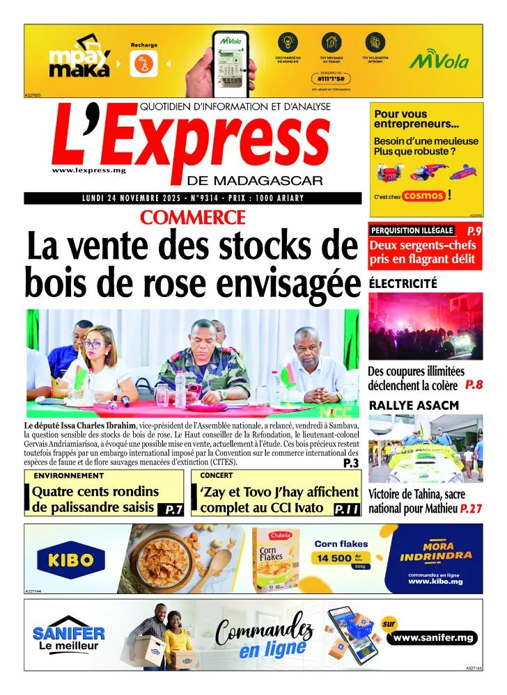 L’Express de Madagascar consacre sa une au dossier environnemental et économique : la vente de stocks de bois de rose est désormais envisagée sous strict encadrement, alors que ces bois précieux restent frappés par un embargo international.
