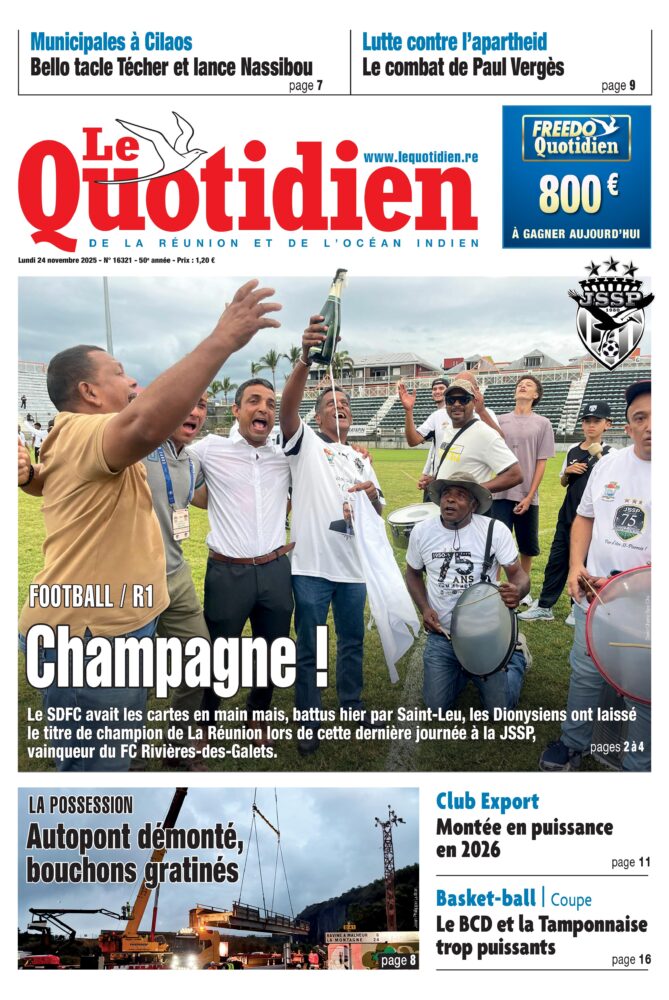 Le Quotidien titre sur l’exploit en football régional : le SDFC craque dans la dernière ligne droite, laissant le titre de champion de La Réunion à la JSSP, malgré un avantage avant la dernière journée.