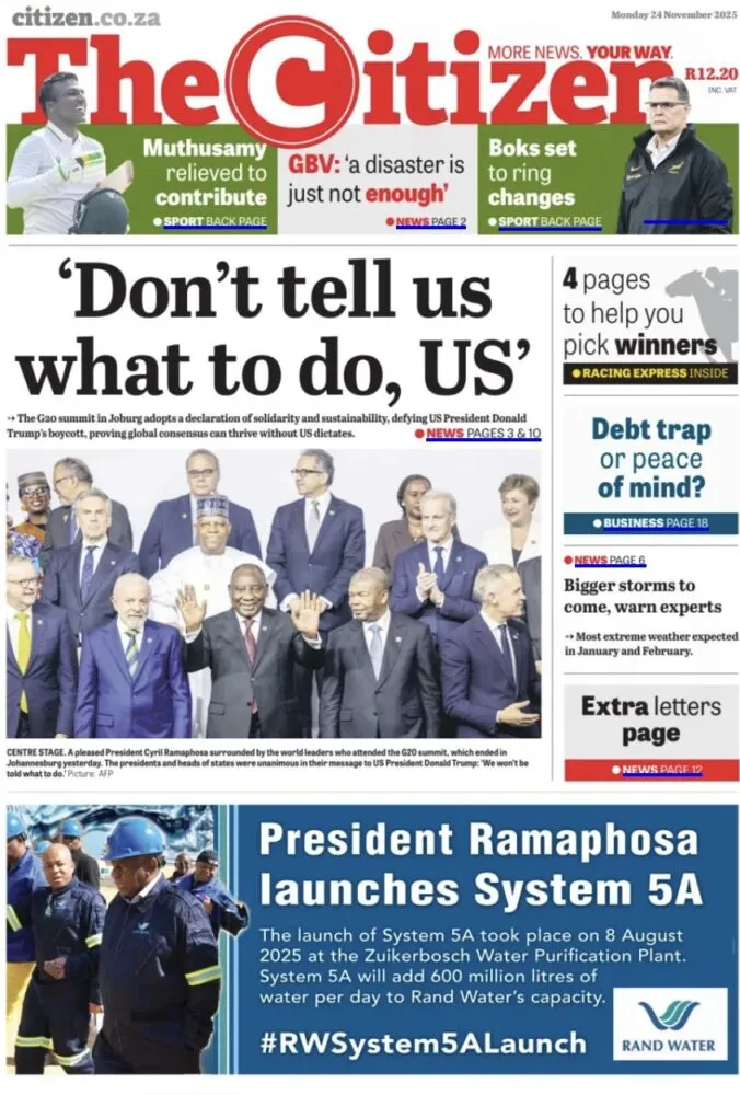 The Citizen revient sur un sommet international très politique, en titrant : “Don’t tell us what to do, US”, en réaction aux tensions diplomatiques autour du G20.
