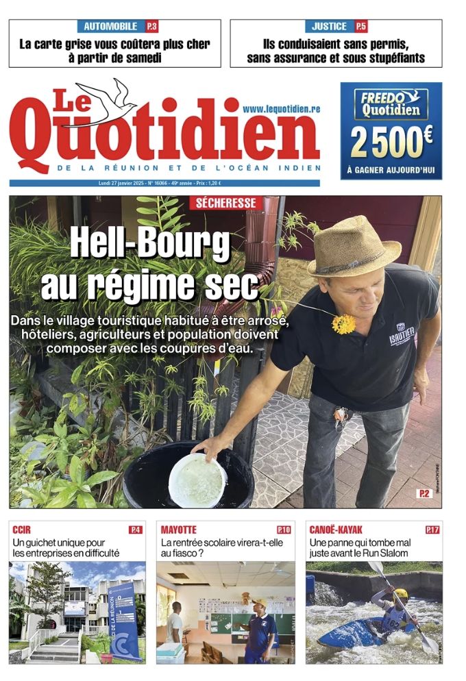 Le titre principal, « Hell-Bourg au régime sec », met en lumière l’impact de la sécheresse sur ce village touristique emblématique de l’île. Les coupures d’eau touchent les habitants, les agriculteurs et les professionnels du tourisme, créant une situation préoccupante pour l’économie locale. Cet article attire l’attention sur l’urgence d’une gestion durable des ressources en eau à La Réunion.