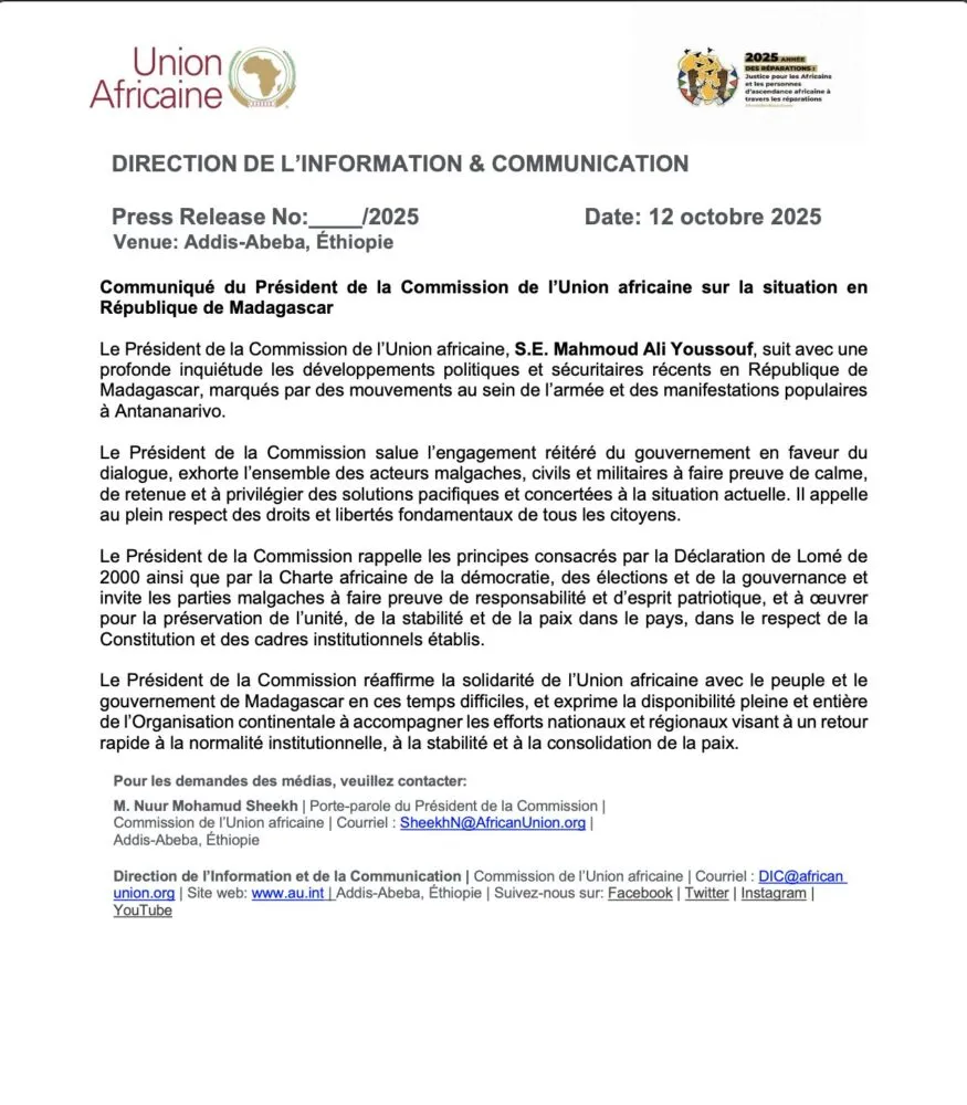 L’Union Africaine (UA) s’est officiellement saisie de la situation politique et sécuritaire tendue à Madagascar. Dans un communiqué rendu public le dimanche 12 octobre 2025, le président de la Commission de l’UA, Mahmoud Ali Youssouf, a exprimé sa vive inquiétude face aux récents mouvements au sein de l’armée et aux manifestations populaires qui agitent la capitale Antananarivo.