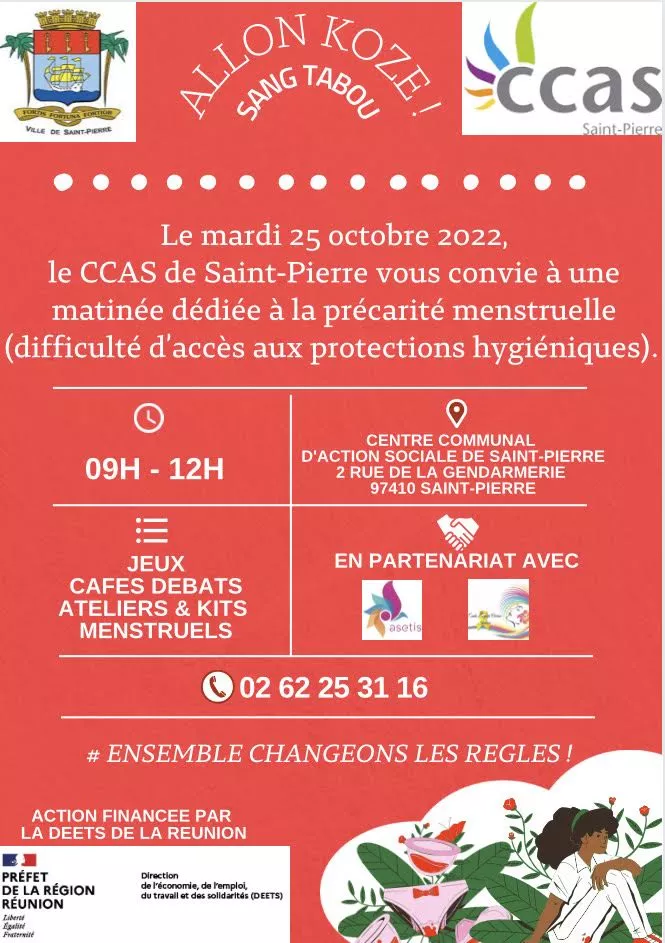« Alon Kozé Sang Tabou » : C’est une matinée d’information, avec distribution de kits, qui se déroulera de 9 heures à 12 heures au CCAS (Centre Communal d’Action sociale), 2 rue de la Gendarmerie à Saint-Pierre. Au programme également : conférences, jeux, débats…