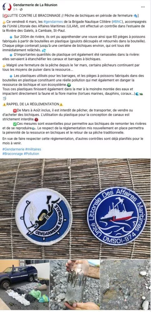 Sur 200m de rivière, ils ont pu appréhender une vouve ainsi que 60 pièges à poissons fabriqués à partir de bouteilles en plastique (goulots découpés et retournés dans la bouteille). Chaque piège contenait jusqu’à une centaine de bichiques environ, qui ont tous été immédiatement relâchés.