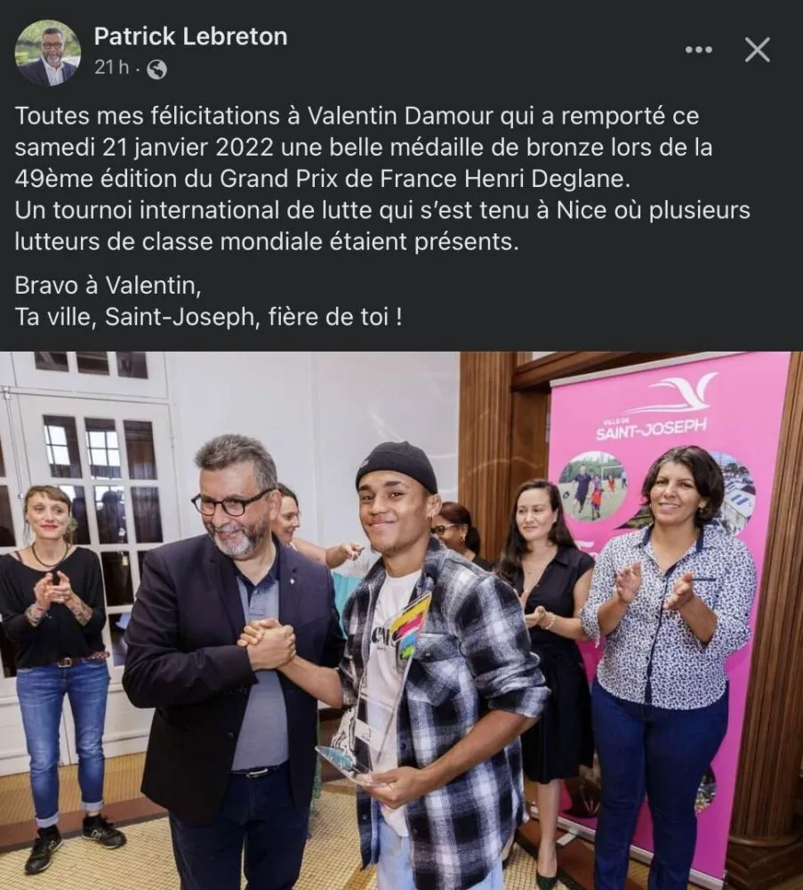 Du 20 au 22 janvier 2022 s’est tenue la 49ème édition du Grand Prix de France Henri Deglane à Nice, un tournoi international de lutte. Plus de 300 athlètes ont participé. Parmi eux, le Réunionnais Valentin Damour qui a remporté ce samedi 21 janvier 2022 une belle médaille de bronze. Le maire de la commune de St-Joseph Patrick Lebreton a tenu à présenter ses félicitations au sportif originaire de la commune :