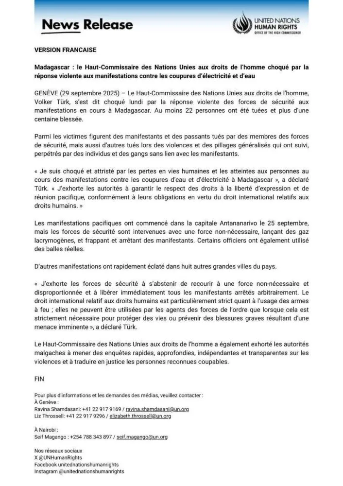 Cette communication des Nations Unies est désormais considérée comme le premier bilan officiel reconnu à l’échelle internationale. Elle confirme la gravité des événements et souligne l’usage d’une force jugée disproportionnée contre des rassemblements qui avaient débuté pacifiquement. En l’absence de communication transparente des autorités malgaches, ce bilan onusien devient la seule référence disponible pour mesurer l’ampleur de la répression en cours dans le pays.