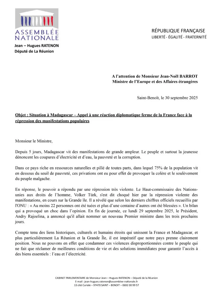Les députés Jean-Hugues Ratenon et Perceval Gaillard ont adressé un courrier au ministre démissionnaire des Affaires étrangères afin d’alerter sur la situation préoccupante à Madagascar.
