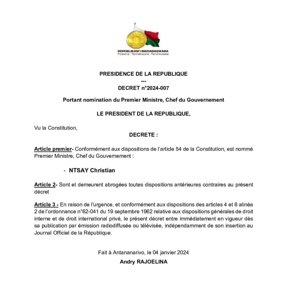 Andry Rajoelina, le Président malgache, a annoncé ce jeudi 4 janvier au palais d’État d’Iavoloha, en présence des parlementaires, sa décision de reconduire Christian Ntsay au poste de Premier Ministre pour son second mandat à la tête du pays.