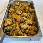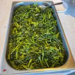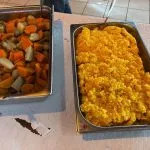 « Pou komansé » : salade de chouchou, salade de pomme de terre, salade de mortadelle au poulet péi.  Ensuite, « Nout caris ek brèdes : cari poulet fermier, cari légumes péi avec comme accompagnements maîs, ravages (songe, manioc, patate douce, fruits à pin) des brèdes citrouille, pariétaire, moutarde, chou de chine ainsi des rougails de saison (bringelles, cougettes, citrons et piments confits). Et pour finir « Nout douceurs » : gâteaux ti son, patate douce, manioc, coulis de goyavier et confiture timate plein-champs, tisane péî et Calicoco de la Chambre. Bon appétit zot tout’ !