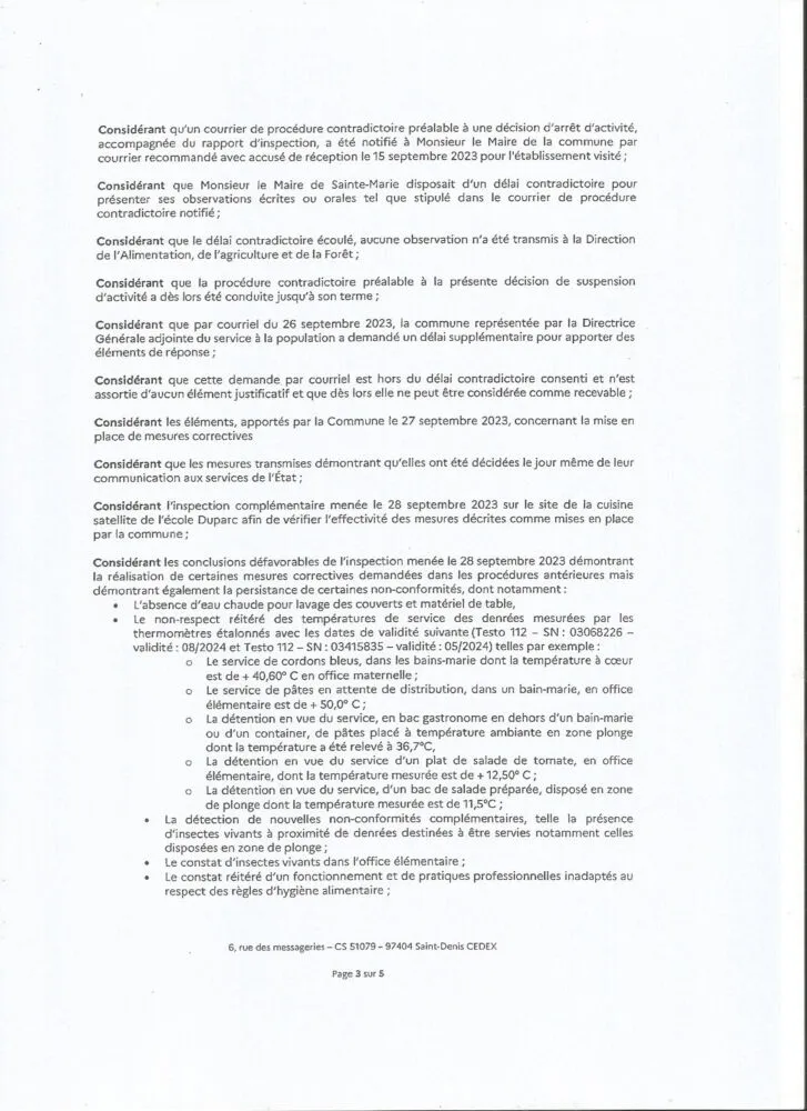 Il s’agit d’une fermeture administrative suite à des contrôles réalisés par la DSV (Direction des services vétérinaires). Il s’avère que la cuisine centrale de la ville de Sainte-Marie située dans le quartier de Beauséjour n’a pas réglé les mises en demeure relatives aux manquements d’hygiène et de sécurité.