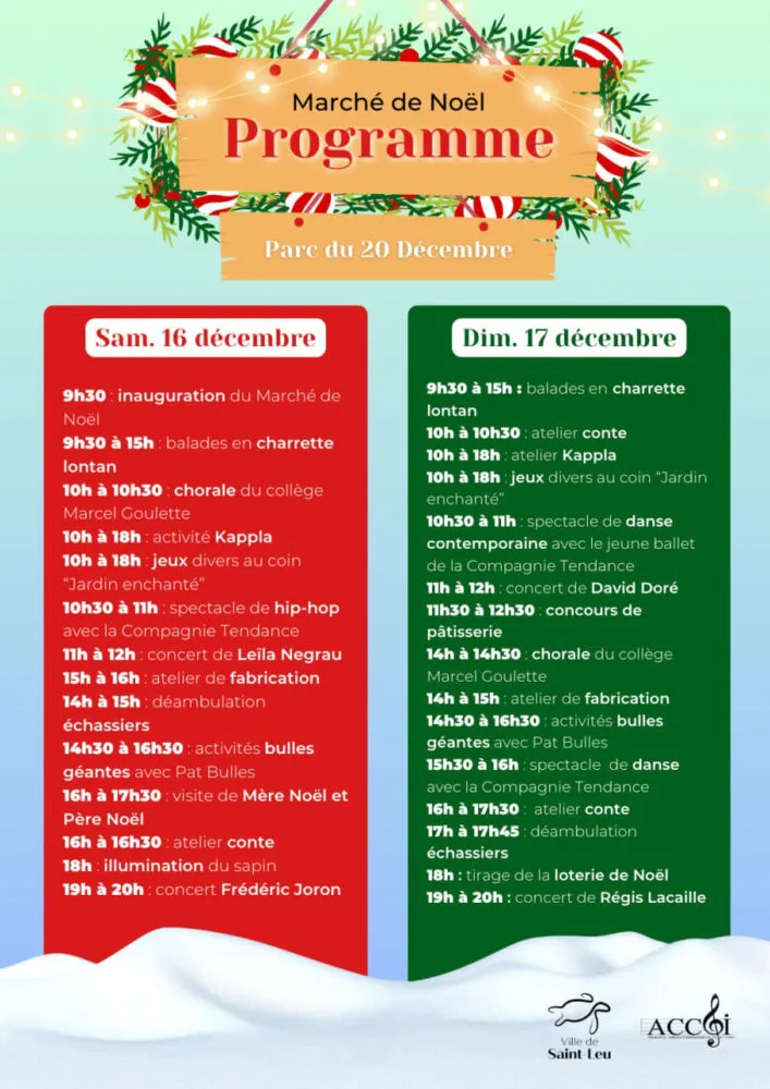 Le parc du 20 décembre s’animera de féérie pour cette deuxième édition du Village de Noël de Saint-Leu, organisé par la Compagnie Tendance (association culturelle ACCOI) et ses partenaires, en collaboration avec la Ville de Saint-Leu.