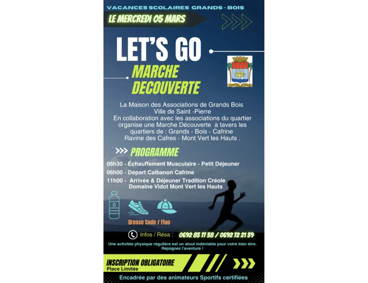 Ce mercredi 5 mars, la Maison des Associations de Grands-Bois, en collaboration avec les associations du quartier, vous convie à une marche découverte à travers les magnifiques paysages de Grands-Bois, La Cafrine, Ravine des Cafres et Mont Vert les Hauts. L’événement débute à 5h30 avec un échauffement musculaire et un petit-déjeuner convivial, suivi du départ à 6h00 depuis le Cabanon Cafrine. La marche se conclura à 11h00 par un déjeuner traditionnel créole au Domaine Vidot.