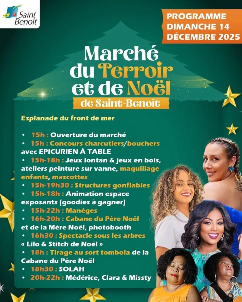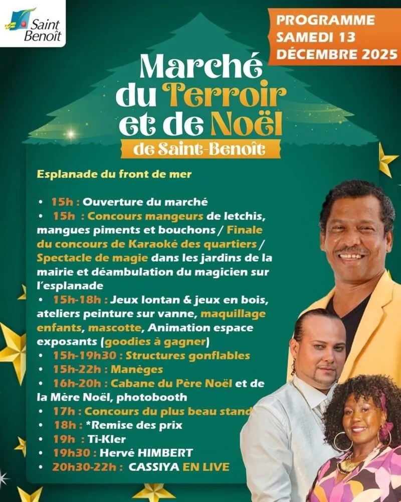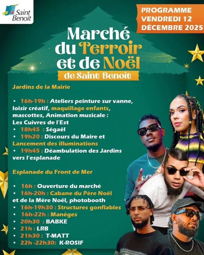 Du vendredi 12 au dimanche 14 décembre 2025, la Ville de Saint-Benoît organise une nouvelle édition de son Marché du Terroir et de Noël sur l’esplanade du front de mer. Un rendez-vous festif qui mettra à l’honneur la magie des fêtes, les produits du terroir et le savoir-faire des artisans locaux. Une programmation musicale variée viendra également rythmer chaque soirée.