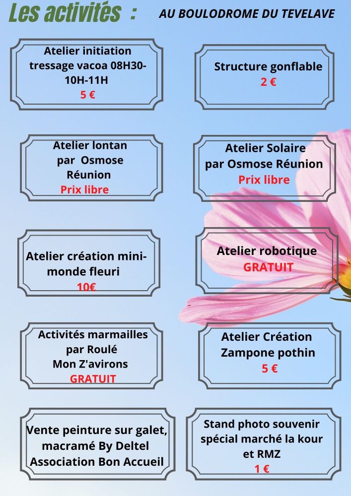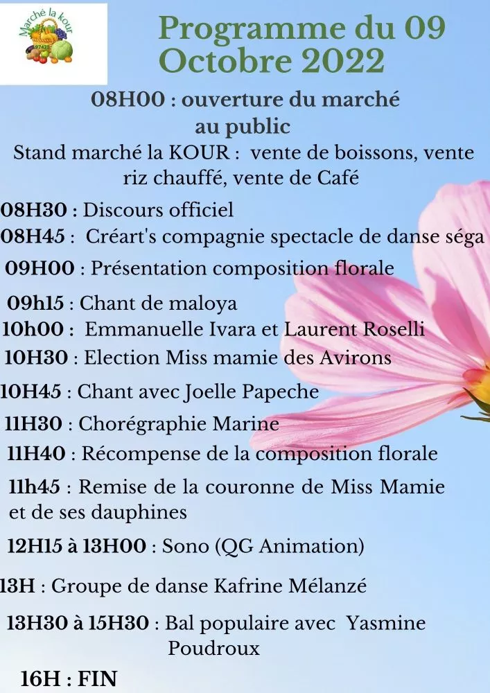Marché La Kour et la ville des Avirons organisent pour le Dimanche 09 Septembre 2022 son Marché forain au Tévelave sur le boulodrome avec comme thème « le marché fleuri et l’élection de Miss Mamie des Avirons 2022 ».