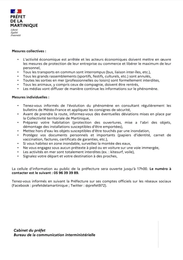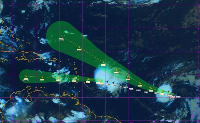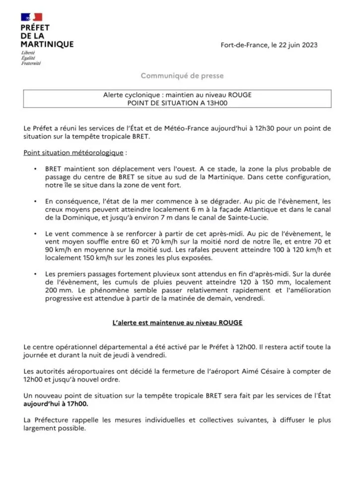 BRET maintient son déplacement vers l’ouest. Le centre de BRET devrait passer entre le sud de la Martinique et Sainte-Lucie, entre la fin de cet après-midi et la première partie de nuit prochaine. Dans cette configuration, notre île se situe dans la zone de vent fort.