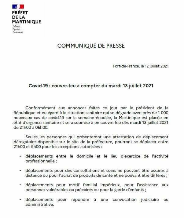 Concernant la Réunion, le Préfet Jacques Billant s’exprimera à 17h ce mardi et les Réunionnais sauront enfin à quelle sauce ils vont être mangés. Il est cependant fort à parier que le couvre-feu soit le même que celui instauré dès ce soir en Martinique. Stanislas Cazelles, préfet de la Martinique, a annoncé hier via un communiqué de presse que dès ce mardi 13 juillet, un couvre-feu entre 21h et 5h du matin entrerait de nouveau en vigueur sur le territoire, avec présentation d’une attestation dérogatoire pour les déplacements essentiels.