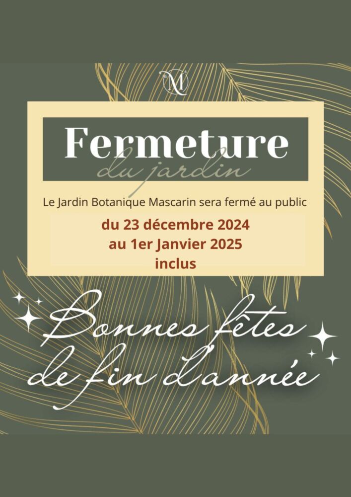 Actualités Mascarin : le jardin botanique de La Réunion sera fermé du 23 décembre au 1er janvier par La Rédaction 23 décembre 2024 1 min de lecture Le Département de La Réunion a annoncé que le jardin Botanique Mascarin sera fermé du 23 décembre 2024 au 1er janvier 2025. Ne manquez pas toute l’actualité de La Réunion ! Abonnez-vous à la newsletter de Free Dom ! Valider Partager Facebook Twitter Pinterest Linkedin Whatsapp Reddit Email Vous pourriez être intéressé par 1 janvier 2026 Jeudi 1ᵉʳ janvier 2026 – Météo, éphéméride et horoscope du jour 31 décembre 2025 Mercredi 31 décembre 2025 – Météo, éphéméride et horoscope du jour 30 décembre 2025 Mardi 30 décembre 2025 – Météo, éphéméride et horoscope du jour La Rédaction Laisser un commentaire Annuler la réponseYour email address will not be published. Enregistrer mon nom, mon e-mail et mon site dans le navigateur pour mon prochain commentaire. Current ye@r * Leave this field empty Article précédent Coupures EDF lundi 23 décembre à Saint-Benoit et Saint-Denis Article suivant Dimitry Payet a un message important pour la 3ᵉ jeunesse réunionnaise (Vidéo) Articles récents... Jeudi 1ᵉʳ janvier 2026 – Météo, éphéméride et horoscope du jour Mercredi 31 décembre 2025 – Météo, éphéméride et horoscope du jour Hommage à Johnny Hallyday sur Free Dom 2 ce 5 décembre Mardi 30 décembre 2025 – Météo, éphéméride et horoscope du jour Saint-Joseph : découverte de 2337 plants de cannabis, arrestation de 2 individus Point sur le réseau routier départemental, 29 décembre à 16H30 Suicide sur le pont de la Rivière d’Abord : importante mobilisation des secours et des forces de l’ordre Radier submergé à Ilet Furcy : la route de Cilaos fermée à la circulation cette nuit Fortes pluies : appel à la plus grande prudence à Saint-Paul Saint-Gilles-les-Bains : une route impraticable, les riverains montent au créneau (VIDEOS)