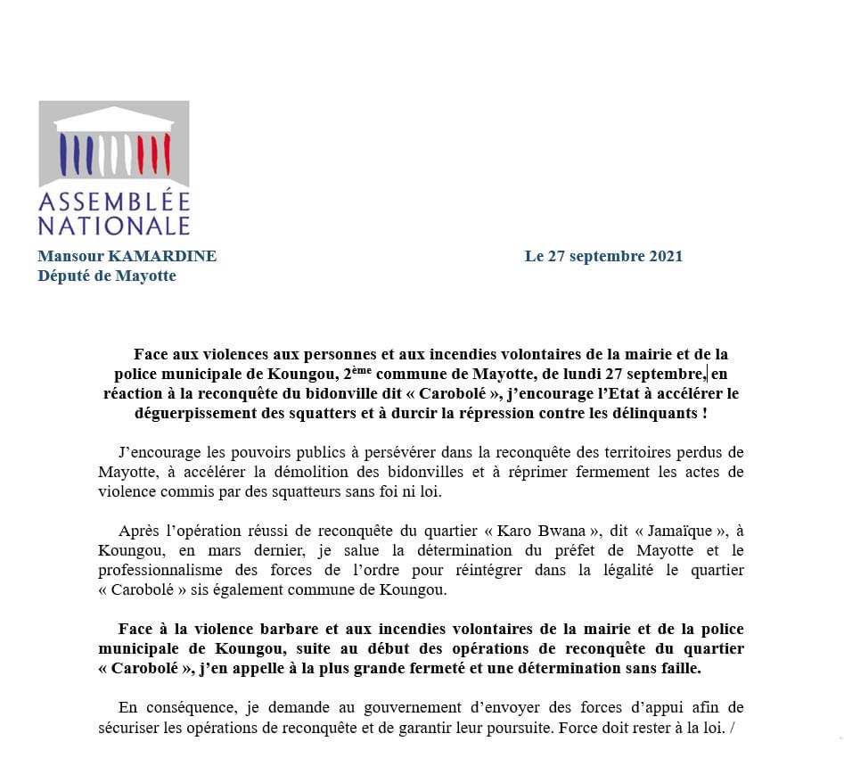 Le député Mansour Kamardine a lui aussi réagi cette nuit : « Force doit rester à la loi! Fermeté et détermination ».