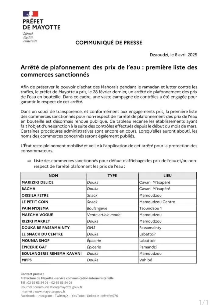 Dzaoudzi, le 6 avril 2025. Alors que la population mahoraise fait face à des pénuries d’eau récurrentes, aggravées par les restrictions et les trafics en cette période de ramadan, certains commerces n’ont pas hésité à profiter de la crise pour gonfler exagérément les prix de vente des bouteilles d’eau. Un comportement que le préfet de Mayotte a tenu à sanctionner avec fermeté.