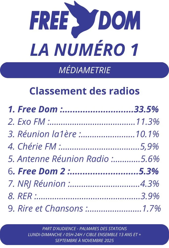Ces résultats soulignent la belle progression continue de la station musicale Free Dom 2, qui s’affirme davantage dans le paysage radiophonique réunionnais grâce à une programmation diversifiée et appréciée des réunionnais.