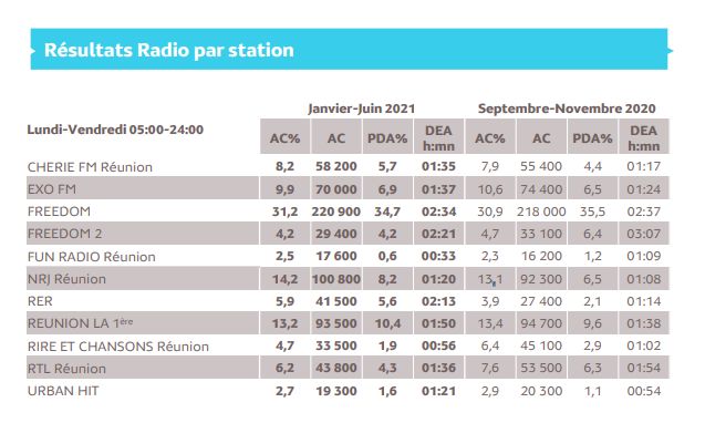Pour la période de Janvier à juin 2021 (du 25 janvier au 13 juin 2021pour la Réunion), Métridom a enregistré l’audience de la radio  dans les départements d’Outre-Mer Guadeloupe / Martinique / Réunion.