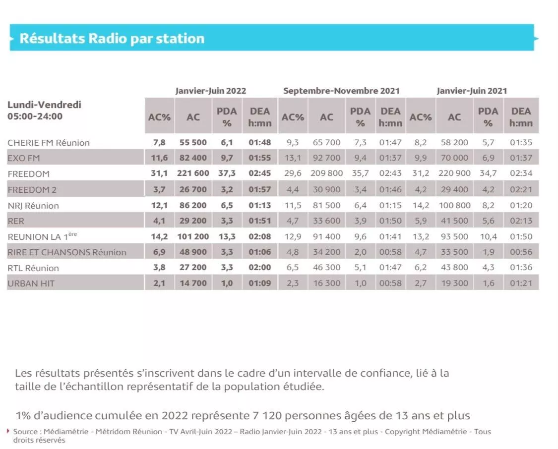 Le nouveau  classement Médiamétrie pour la période de janvier au juin 2022 a été rendu public. Il s’agit d’une étude menée par Métridom sur le taux d’audience des radios à La Réunion. Comme dans les années précédentes, Radio Free  Dom reste  toujours  en  tête  du   classement,  devant  les  autres  radios  de  l’île.