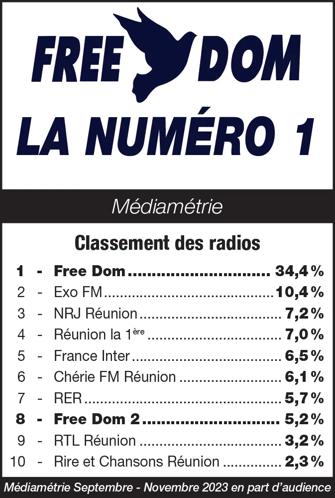 Médiamétrie septembre-novembre 2023 : Radio Free Dom domine les ondes à La Réunion.