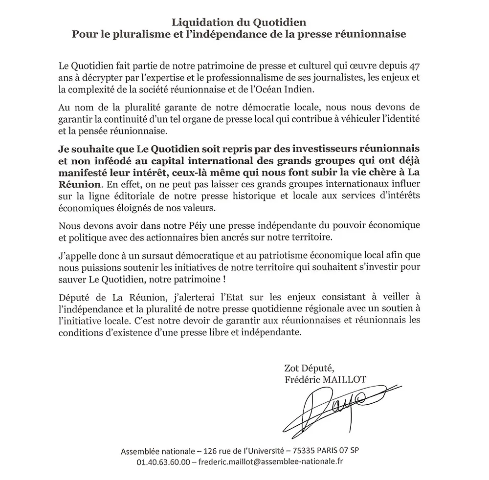 Le communiqué de Frédéric MAILLOT, Député de La Réunion, en soutien du Quotidien traversant des difficultés :