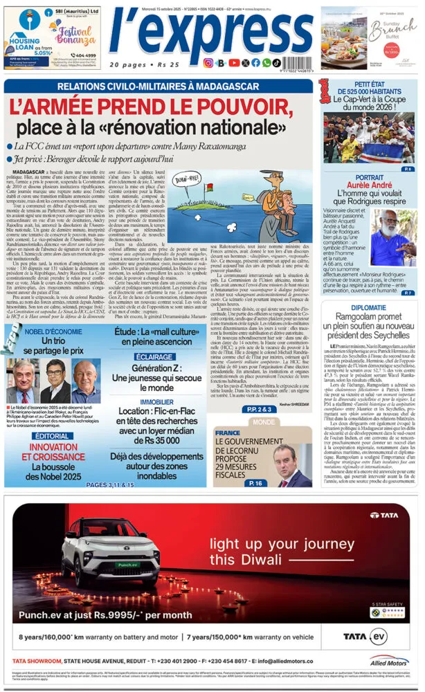 Les unes de la région s’accordent sur un tournant historique à Antananarivo. Après des jours de chaos et la fuite du président Andry Rajoelina, L’Express de Madagascar et Le Quotidien de La Réunion confirment la prise de pouvoir par les militaires. Le colonel Michaël Randrianirina, dans une déclaration solennelle depuis le palais d’Ambohitsorohitra, annonce la suspension de la Constitution et la mise en place d’une présidence collégiale composée d’officiers et de gendarmes. Le gouvernement civil est dissous, tandis qu’un appel au “calme et à la reconstruction” tente d’éviter la guerre civile. Le Défi Quotidien de Maurice souligne que la Mauritius Chamber of Commerce and Industry s’inquiète pour la sécurité des entreprises mauriciennes implantées sur la Grande Île, alors que des militaires armés patrouillent dans les rues de Tananarive. L’incertitude politique malgache provoque déjà des répercussions économiques régionales.