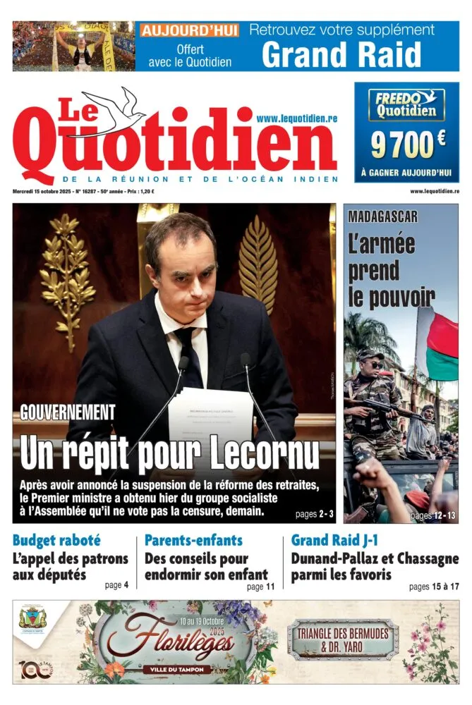 En métropole comme outre-mer, l’attention se porte sur Sébastien Lecornu. Le Quotidien titre sur “Un répit pour Lecornu” : après l’annonce de la suspension de la réforme des retraites, le Premier ministre a obtenu in extremis le soutien du groupe socialiste à l’Assemblée, lui évitant une motion de censure. Dans les collectivités ultramarines, cette décision est perçue comme un souffle politique nécessaire, à la veille d’une révision des priorités budgétaires. Sur le plan local, la tension économique reste palpable. Les entreprises appellent les députés à préserver leurs budgets d’investissement, tandis que le Grand Raid s’apprête à lancer sa 32e édition dans une atmosphère d’attente et de ferveur.