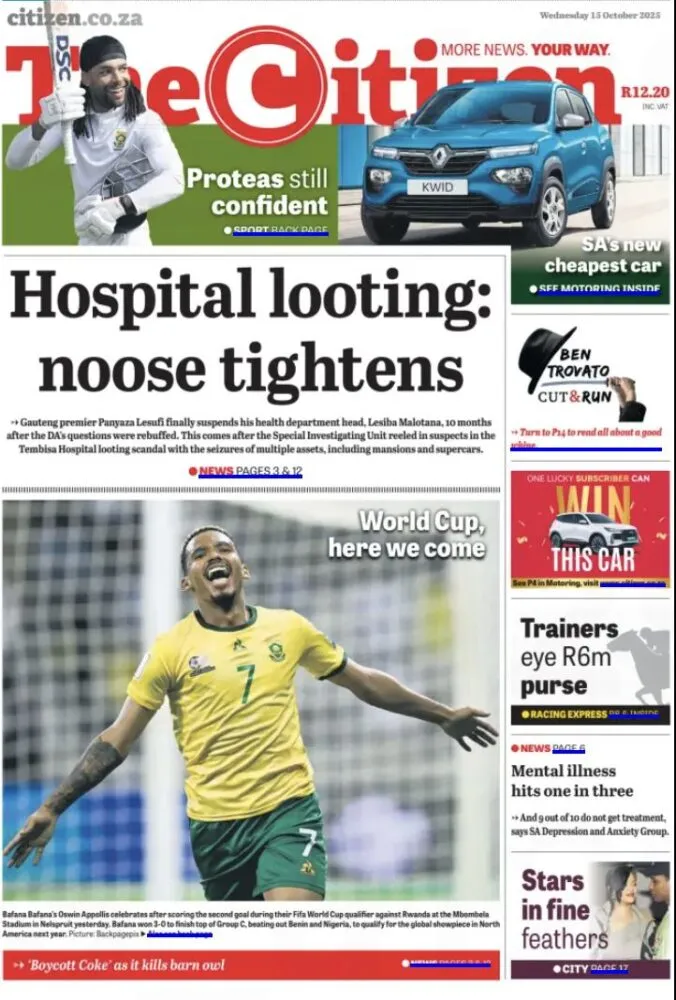 The Citizen met en lumière le scandale du “Tembisa Hospital looting”, une affaire de corruption massive impliquant des responsables du département de la santé de la province de Gauteng. Des villas, voitures de luxe et comptes bancaires ont été saisis après une enquête de la Special Investigating Unit. Le Premier ministre provincial a suspendu le chef du département, Lesiba Malotana. Mais une autre actualité redonne le sourire : les Bafana Bafana se qualifient pour la Coupe du monde 2026 après leur victoire 3-0 contre le Rwanda. “World Cup, here we come”, titre fièrement le quotidien.