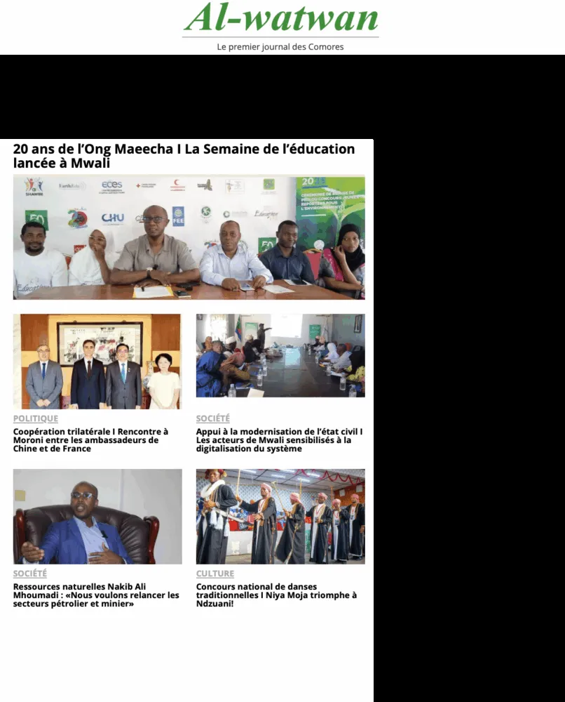 Al-Watwan célèbre les 20 ans de l’ONG Maeecha et le lancement de la Semaine de l’éducation à Mwali. Les autorités locales ont également engagé une coopération trilatérale avec les ambassadeurs de Chine et de France, centrée sur le développement et la formation. La modernisation de l’état civil et la digitalisation du système administratif sont à l’ordre du jour, tandis que la culture comorienne se met en scène avec le concours national de danses traditionnelles, remporté par le groupe Niya Moja à Ndzuani.