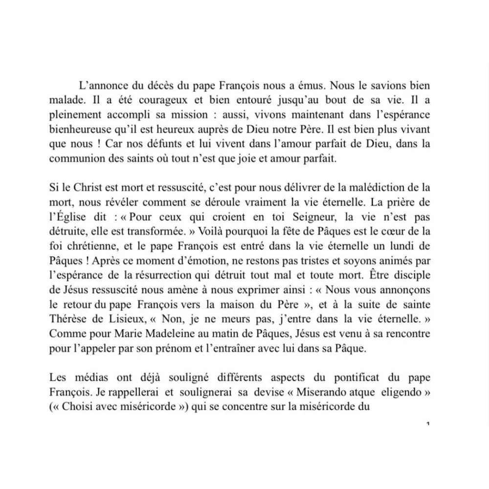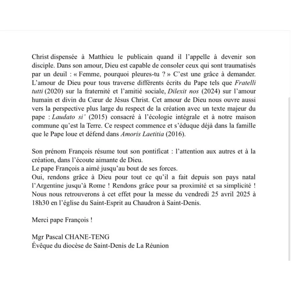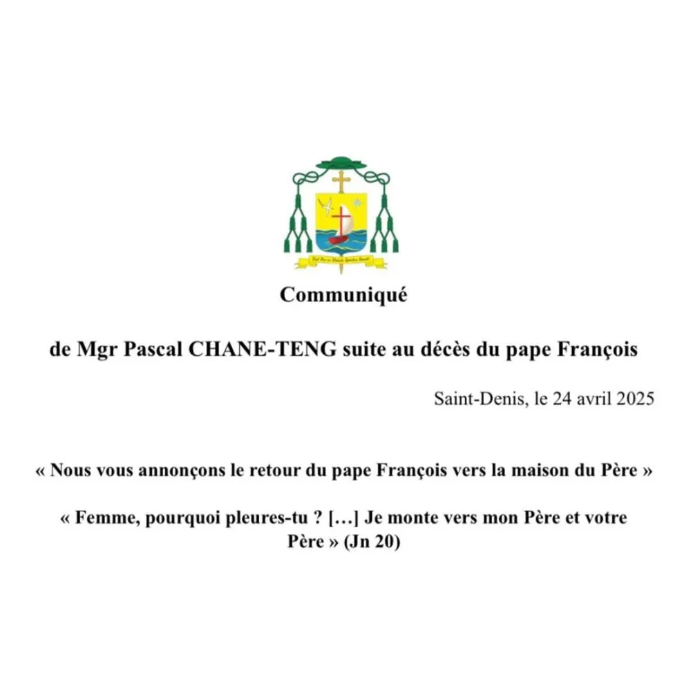 Suite au décès du pape François, un communiqué de Mgr Pascal CHANE-TENG, évêque de Saint-Denis de La Réunion, a été publié ce 24 avril 2025 pour rendre hommage à son pontificat. À cette occasion, une messe d’action de grâce sera célébrée le vendredi 25 avril à 18h30 à l’église Saint-Esprit au Chaudron, à Saint-Denis.