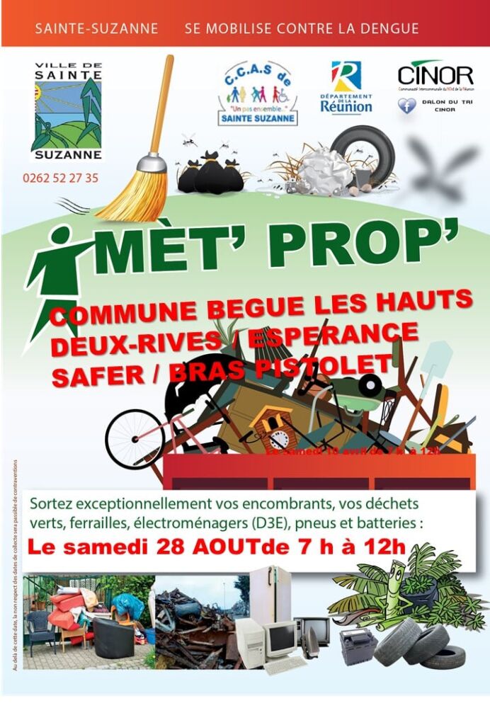 L’ARS et le CCAS de Sainte Suzanne seront également présents pour sensibiliser les habitants aux bons gestes à adopter pour enrayer l’épidémie de dengue à l’approche de l’hiver austral. Ensemble, nous pouvons agir pour la Santé de tous et lutter contre les dépôts sauvages.