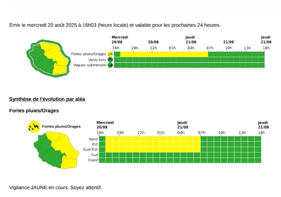 Actualités Météo : alerte orages et fortes pluies dans le Nord, l’Est et le Sud-Est à partir de 17h par La Rédaction 20 août 2025 1 min de lecture Dans son bulletin à 16h, Météo France annonce une vigilance fortes pluies/orages sur les régions du Nord, de l’Est et du Sud-Est à compter de 17h00 locales ce mercredi jusqu’au Jeudi 21 Août 2025 à 07h00 locales au moins. Ne manquez pas toute l’actualité de La Réunion ! Abonnez-vous à la newsletter de Free Dom ! Valider Partager Facebook Twitter Pinterest Linkedin Whatsapp Reddit Email Vous pourriez être intéressé par 31 décembre 2025 Mercredi 31 décembre 2025 – Météo, éphéméride et horoscope du jour 30 décembre 2025 Mardi 30 décembre 2025 – Météo, éphéméride et horoscope du jour 29 décembre 2025 Saint-Joseph : découverte de 2337 plants de cannabis, arrestation de 2 individus La Rédaction Laisser un commentaire Annuler la réponseYour email address will not be published. Enregistrer mon nom, mon e-mail et mon site dans le navigateur pour mon prochain commentaire. Current ye@r * Leave this field empty Article précédent Attention aux fausses informations : les Caf rappellent la vérité face aux rumeurs Article suivant Tampon : Une dynamique engagée pour le confort et la réussite des élèves Articles récents... Mercredi 31 décembre 2025 – Météo, éphéméride et horoscope du jour Hommage à Johnny Hallyday sur Free Dom 2 ce 5 décembre Mardi 30 décembre 2025 – Météo, éphéméride et horoscope du jour Saint-Joseph : découverte de 2337 plants de cannabis, arrestation de 2 individus Point sur le réseau routier départemental, 29 décembre à 16H30 Suicide sur le pont de la Rivière d’Abord : importante mobilisation des secours et des forces de l’ordre Radier submergé à Ilet Furcy : la route de Cilaos fermée à la circulation cette nuit Fortes pluies : appel à la plus grande prudence à Saint-Paul Saint-Gilles-les-Bains : une route impraticable, les riverains montent au créneau (VIDEOS) Très grands excès de vitesse : un délit passible de prison depuis le 29 décembre 2025