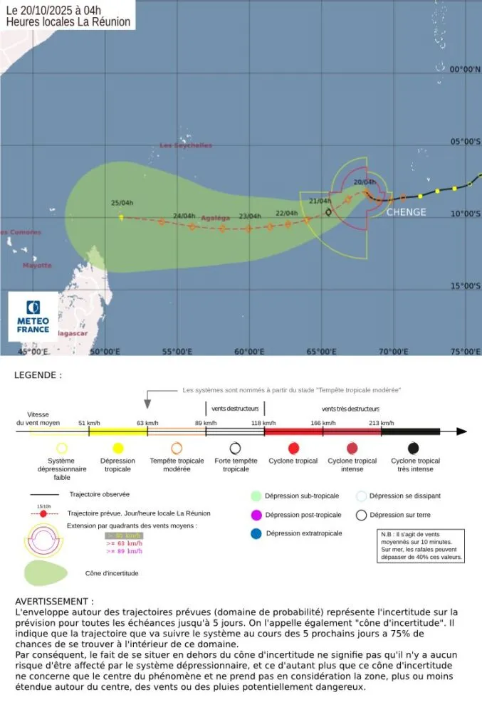 Contrairement à certaines informations relayées par des « confrères« , la tempête modérée Chenge n’aura aucun impact sur La Réunion ni sur Mayotte. Le système dépressionnaire évolue très loin des Mascareignes et suit une trajectoire orientée vers le centre de l’océan Indien, sans danger pour nos îles.