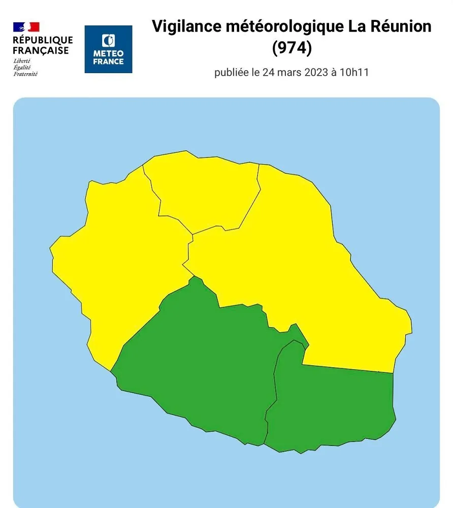 Selon météo France, après une belle matinée ensoleillée, les nuages envahissent les hauts plateaux en ce vendredi 24 mars 2023. Au fil des heures, ces nuages deviennent menaçants. En fin de matinée, toute l’île est sous un ciel nuageux et les averses se produisent dans les hauteurs.