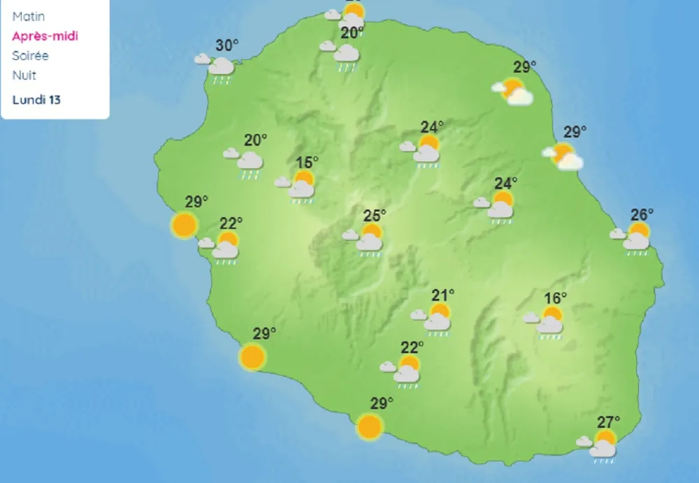 L’après-midi, le ciel est nuageux à l’intérieur des terres, avec des averses attendues plus intenses sur les hauts de Saint-Paul, Saint-Gilles et La Possession. Ces pluies peuvent localement glisser vers l’océan sur la côte nord.