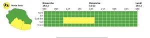 Actualités Météo : vigilance jaune pour vents forts dans le Sud et le Sud-Est ce dimanche par Claudie 14 décembre 2025 1 min de lecture Une vigilance jaune pour vents forts est en vigueur ce dimanche, de 12h à 18h, dans les secteurs Sud et Sud-Est. Le reste du département n’est pas concerné. Ne manquez pas toute l’actualité de La Réunion ! Abonnez-vous à la newsletter de Free Dom ! Valider Partager Facebook Twitter Pinterest Linkedin Whatsapp Reddit Email Vous pourriez être intéressé par 30 décembre 2025 Mardi 30 décembre 2025 – Météo, éphéméride et horoscope du jour 29 décembre 2025 Saint-Joseph : découverte de 2337 plants de cannabis, arrestation de 2 individus 29 décembre 2025 Point sur le réseau routier départemental, 29 décembre à 16H30 Claudie Laisser un commentaire Annuler la réponseYour email address will not be published. Enregistrer mon nom, mon e-mail et mon site dans le navigateur pour mon prochain commentaire. Current ye@r * Leave this field empty Article précédent Municipales 2026 à la Possession : Jérôme Testan candidat des « Forces possessionnaises » Article suivant Conseil communautaire de la Cirest : « des projets structurants pour l’eau » Articles récents... Hommage à Johnny Hallyday sur Free Dom 2 ce 5 décembre Mardi 30 décembre 2025 – Météo, éphéméride et horoscope du jour Saint-Joseph : découverte de 2337 plants de cannabis, arrestation de 2 individus Point sur le réseau routier départemental, 29 décembre à 16H30 Suicide sur le pont de la Rivière d’Abord : importante mobilisation des secours et des forces de l’ordre Radier submergé à Ilet Furcy : la route de Cilaos fermée à la circulation cette nuit Fortes pluies : appel à la plus grande prudence à Saint-Paul Saint-Gilles-les-Bains : une route impraticable, les riverains montent au créneau (VIDEOS) Très grands excès de vitesse : un délit passible de prison depuis le 29 décembre 2025 Fermeture temporaire du sentier de la Canalisation des Orangers (cirque de Mafate)