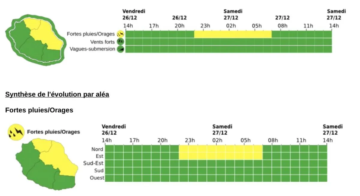 La Réunion est placée en vigilance jaune pour fortes pluies et orages à compter de ce vendredi 26 décembre, pour une durée de 24 heures. Selon le bulletin de Météo-France, une dégradation pluvio-orageuse est attendue, notamment en soirée et dans la nuit.