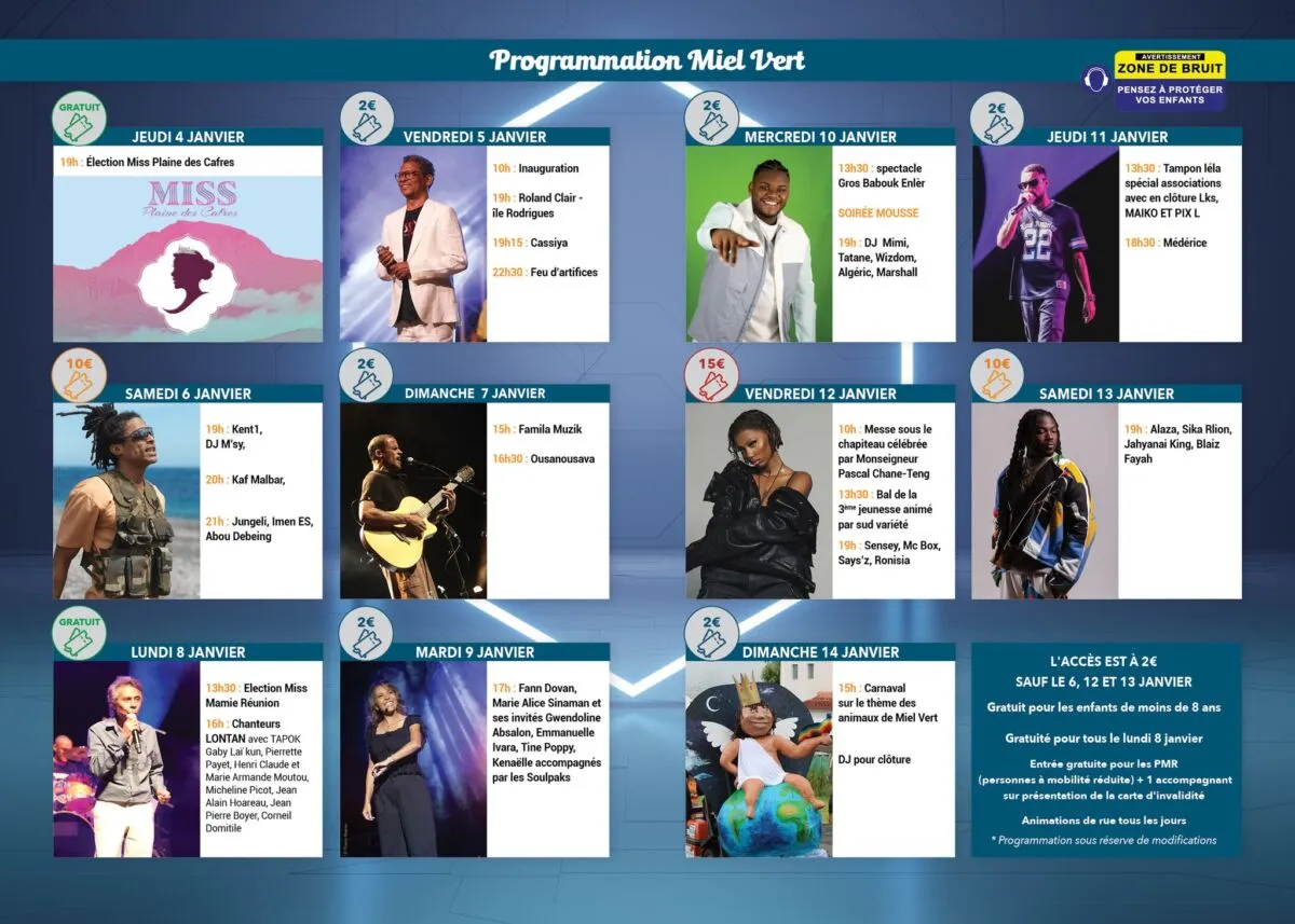 La ville du Tampon se prépare à célébrer les 40 ans du Miel Vert du 5 au 14 janvier prochains. Cette fête emblématique de l’île promet une édition 2024 mémorable, avec un programme riche en activités, animations, attractions et concerts. Les festivités complètes sont disponibles sur le site internet de la Ville: letampon.fr.