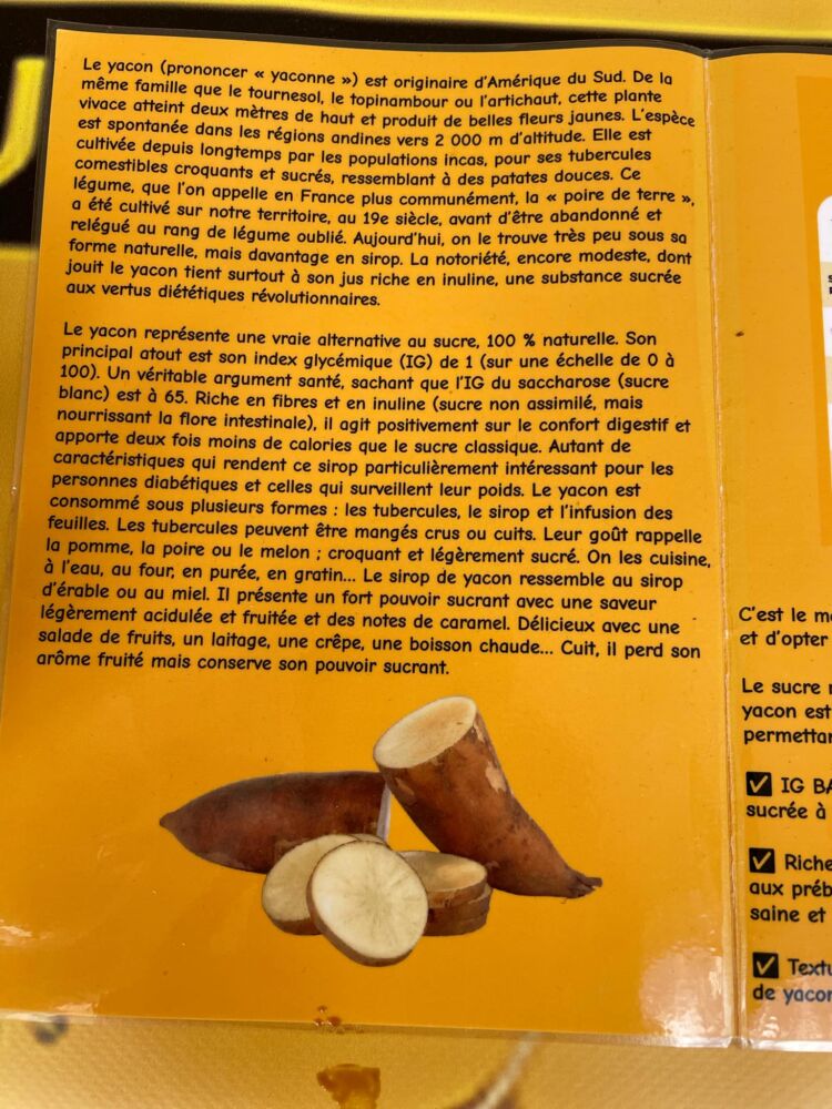 Nous avons rencontré un vendeur passionné qui nous a présenté les multiples bienfaits du yacon et de son sirop. Cette alternative au sucre blanc et roux est bio, sans additifs, et offre de nombreux avantages : quatre fois moins sucrant, deux fois moins calorique, et riche en fibres prébiotiques pour le bien-être intestinal.