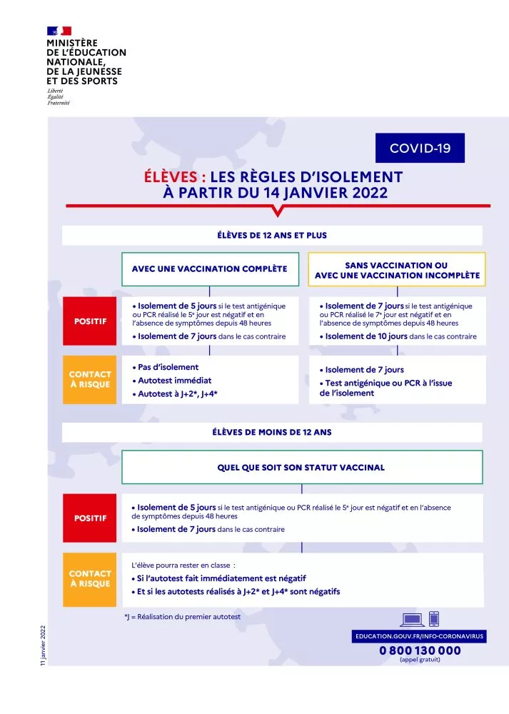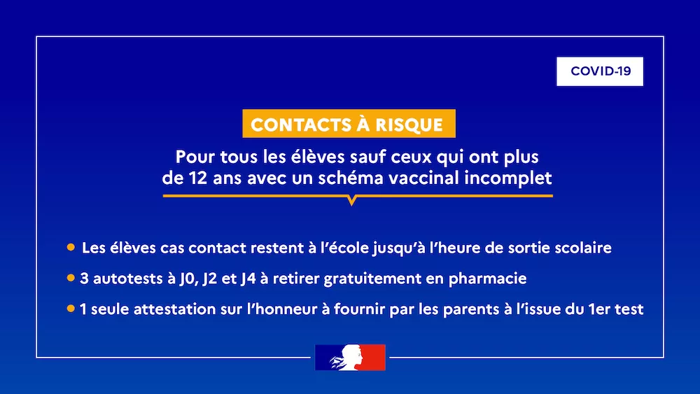 - Les élèves cas contact de moins de 12 ans ainsi que les élèves de plus de 12 ans bénéficiant d’un schéma vaccinal complet se verront remettre gratuitement 3 autotests en pharmacie et n’auront plus à réaliser obligatoirement un test antigénique ou un test PCR.