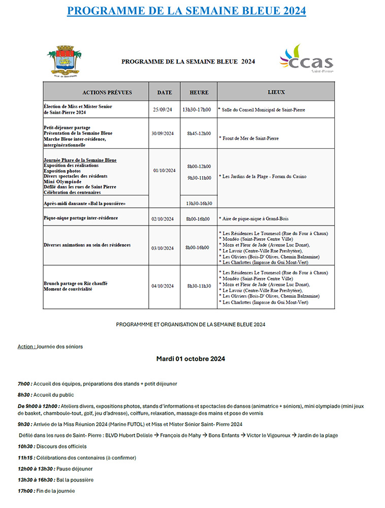 Organisée par le CCAS de Saint-Pierre, la Semaine Bleue 2024 se déroulera du 30 septembre au 6 octobre. Parmi les moments forts, citons la marche bleue intergénérationnelle, les activités en résidences seniors, ainsi que l’élection de Miss et Mister Sénior. Une grande manifestation aura lieu le 1er octobre dans les jardins de la Plage.
