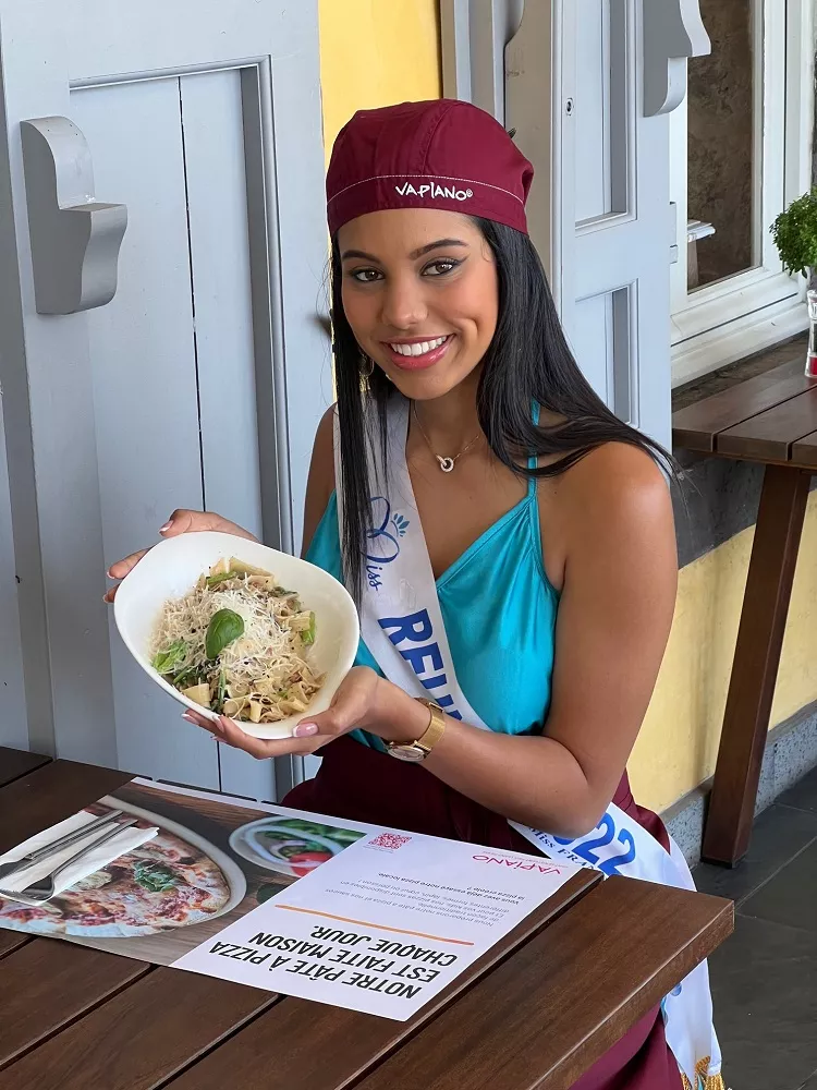 Notre reine de beauté, n’a pas fait les choses à moitié car avant d’élaborer sa propre recette, elle a commencé par faire elle-même ses pâtes fraîches, faites avec de l’eau, de la semoule de blé, un peu de dextérité et les conseils du Vapianisti de Saint-Paul. Miss Réunion a ensuite choisi elle-même les ingrédients pour élaborer sa pasta que nous vous dévoilons ici : sur une base de tagliatelle carbonara (crème et lardon) ajoutez des champignons et de brèdes pour la touche créole.