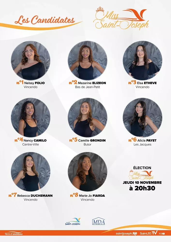 Elles sont 8 prétendantes au titre de Miss Saint-Joseph. Une seule sera élue le samedi 10 novembre prochain lors de la grande soirée de la fête safran à la Plaine des Grègues !