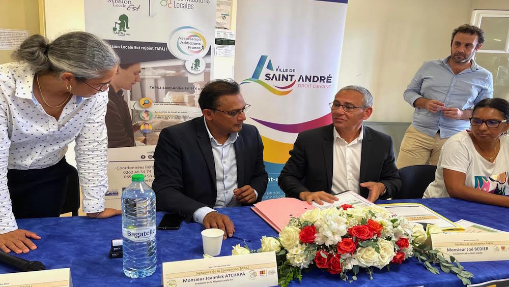 C’est l’objectif de la convention de partenariat signée ce mercredi après-midi (9 novembre) par Jeannick Atchapa (président de la Mission Locale Est), Joé Bédier (maire de Saint-André et président du CCAS) et l’Association Addictions France représentée par Cédric Hoareau, éducateur spécialisé. Une signature qui s’est déroulée dans les locaux de l’EHPAD de Saint-André en présence des représentants de l’association « Momon Papa Lé la » et de Richena Sévingué, agricultrice à Ravine-Creuse. Ils accueillent sur leur exploitation respective des « Tapajeurs », des jeunes qui souhaitent sortir de leurs addictions aux produits psychotropes ou à l’alcool.