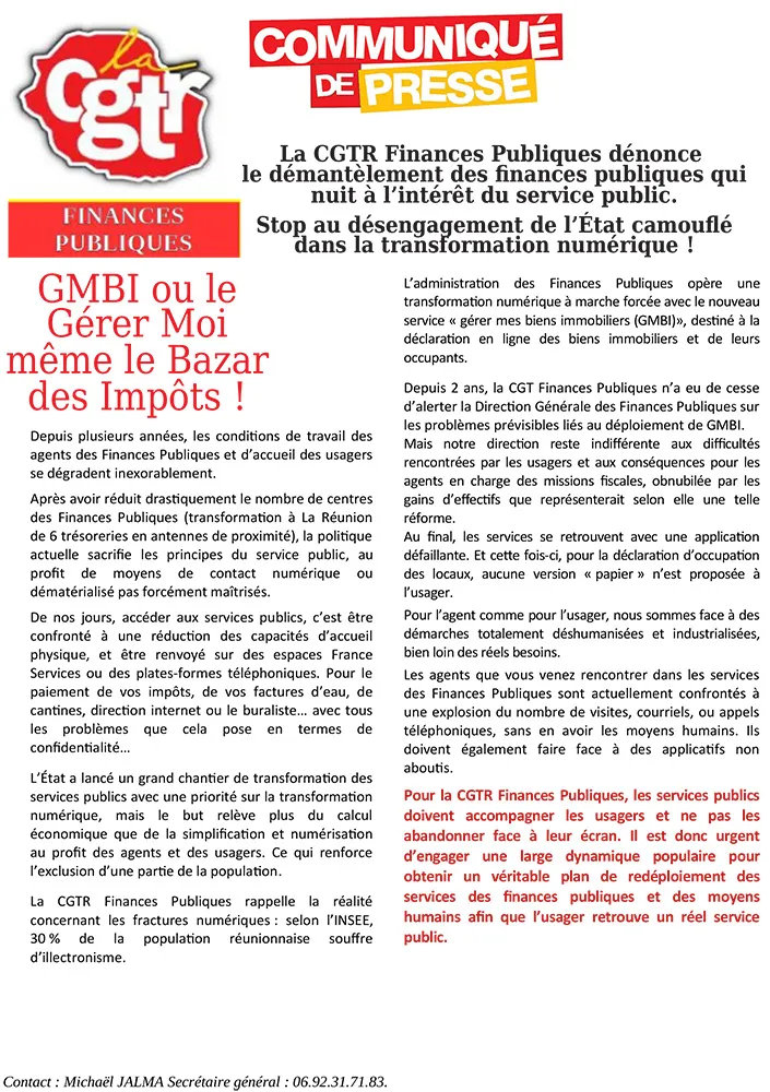 La CGTR Finances Publiques annonce une action prévue le lundi 31 juillet à partir de 7h30 au centre des Finances Publiques de Champ-Fleuri à Saint-Denis. Cette initiative vise à dénoncer les impacts négatifs de l’application GMBI, « Gérer mes Biens Immobiliers », sur les usagers.