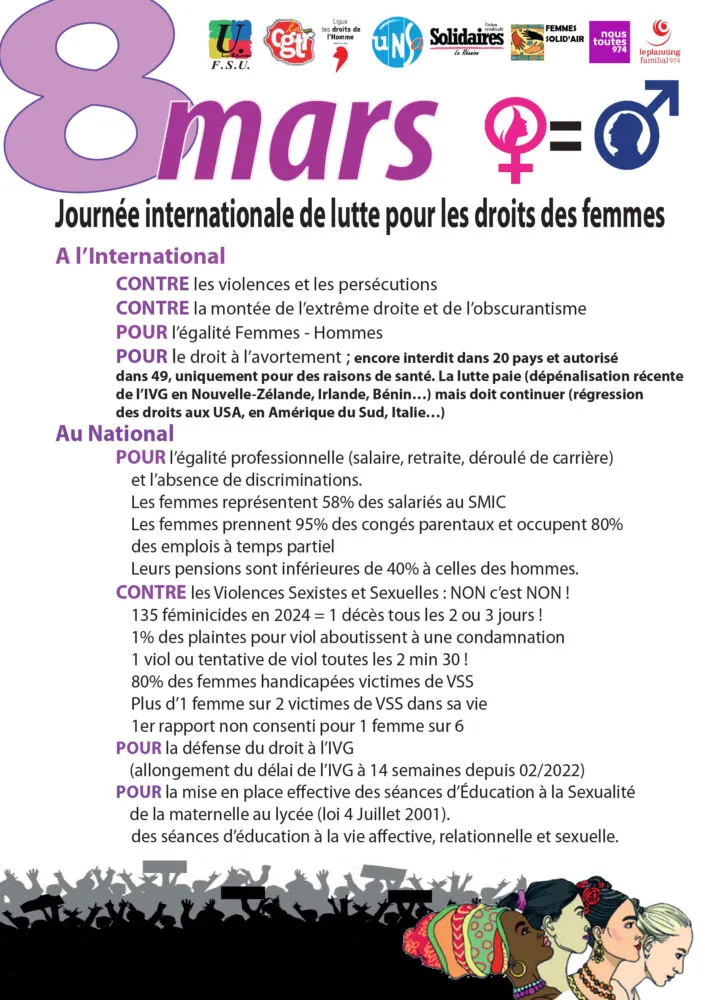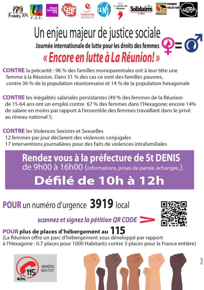 Ce 8 mars, nous appelons donc chaque réunionnaise et réunionnais à venir dans les jardins de la préfecture à St Denis pour rencontrer les actrices et acteurs de terrain et participer à la marche prévue à partir de 9h00.