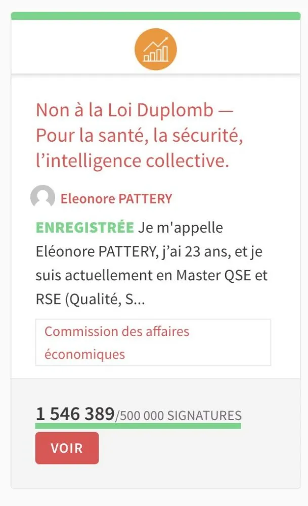 La pétition citoyenne demandant l’abrogation de la loi Duplomb a dépassé ce samedi 19 juillet à 16 h le seuil des 1 500 000 signatures, un record inédit sur la plateforme officielle des pétitions de l’Assemblée nationale . Initiée le 10 juillet par Éléonore Pattery, une étudiante de 23 ans en Master QSE, elle dénonce un texte qualifié « d’aberration scientifique, éthique, environnementale et sanitaire ».