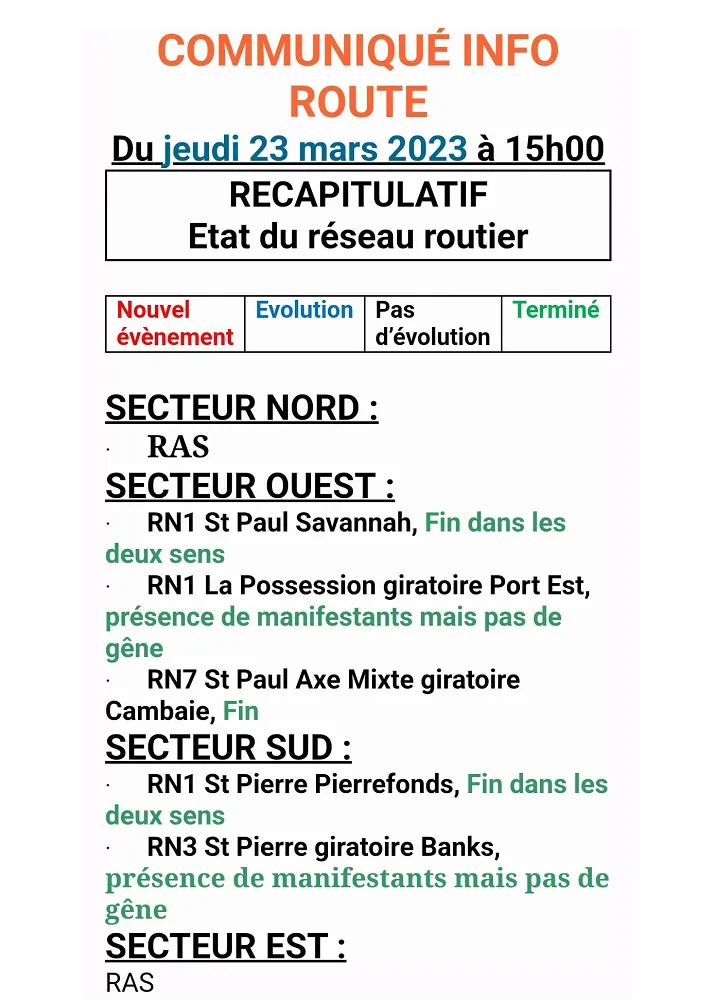 6. Blocage rond point Port Est à l’entrée de la Possession sens vers St paul par FO. Barrage filtrant. 1 à 2 voitures laissés passés toutes les 5min. Toutes les sorties sont bloqués et on est obligé de repartir vers la Possession.. Pr ma part j’ai eu droit à 5min de blocage de plus au niveau des manifestants car j’ai montré des signes d’agacement… car mon fils de 6mois était en furie dans la voiture… Beau geste..